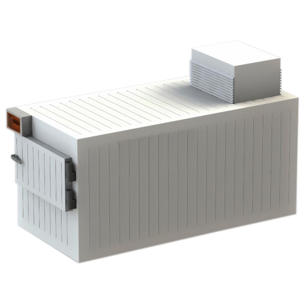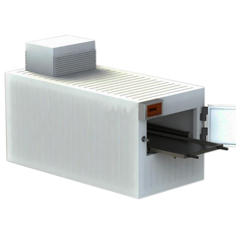 Холодильное оборудование для такой камеры может располагаться сверху, сбоку или снаружи помещения. При этом необходимо учитывать габариты камеры с холодильным агрегатом. Для охлаждения используется промышленный Холодильный агрегат L’unite Hermetique французского производства и итальянский воздухоохладитель LU-VE, управление которыми осуществляется с помощью пульта на базе микропроцессорного термостата, собран на верхней панели термобокса.